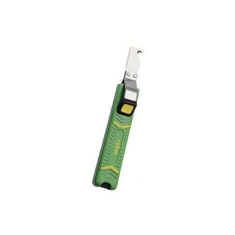 Dénude-câbles à lame crochet tournante. Manche bimatière pour une meilleure prise en main et un confort dutilisation accru, poussoir bimatière «antiglisse», réglage facile de la profondeur de coupe par molette, lame de rechange incluse. Lame traitée au ni
