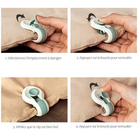 Ces clips de housse de couette peuvent être utilisés pour toutes sortes de couettes, qu’elles soient fines ou épaisses. Ouvrez simplement les clips de la couette vers le haut et insérez la couette dans les clips, puis appuyez sur la boucle.