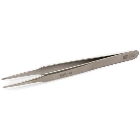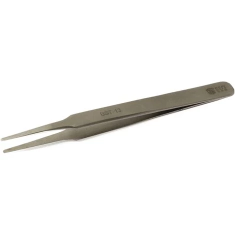 Pinces à outils de précision BEST (modèle BST-13). Brucelles en acier inoxydable de haute qualité. Longueur: 120 mm. Pince droite droite. Embout non magnétique, très approprié pour travailler avec des composants électroniques sensibles à l’électrostatique. Résistance aux acides. Outil de précision du fabricant renommé BEST.