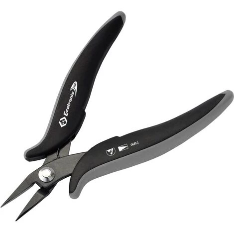 Pince à becs pointus de précision, légère, avec des becs courts et lisses. Les bords extérieurs arrondis évitent d’endommager les composants adjacents. Corps de la pince en acier spécial outils, trempé pour une efficacité durable. Surface brunie en noir pour la protection contre la corrosion et un éblouissement réduit. Poignées à gaine dissipative électrostatique – Résistance de fuite 10⁸. Poignées bi-matières en version incurvée pour travailler confortablement. Ressort de rappel pour un confort optimal en cas de travaux répétitifs. Articulation avec rivet solide en acier inoxydable.