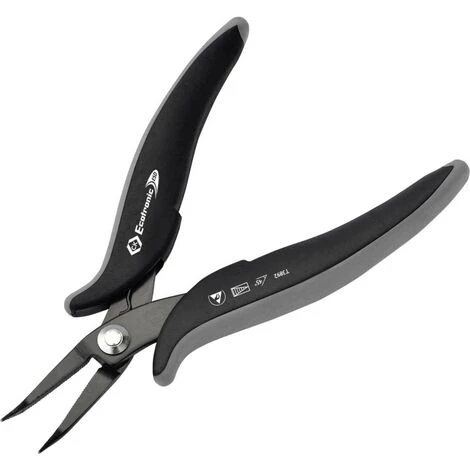 Pince à becs pointus de précision, légère, avec des pointes de becs coudées à 45 degrés et de longs becs dentés. Les bords extérieurs arrondis évitent d’endommager les composants adjacents. Corps de la pince en acier spécial outils, trempé pour une efficacité durable. Surface brunie en noir pour la protection contre la corrosion et un éblouissement réduit. Poignées à gaine dissipative électrostatique – Résistance de fuite 10⁸. Poignées bi-matières en version incurvée pour travailler confortablement. Ressort de rappel pour un confort optimal en cas de travaux répétitifs. Articulation avec rivet solide en acier inoxydable.