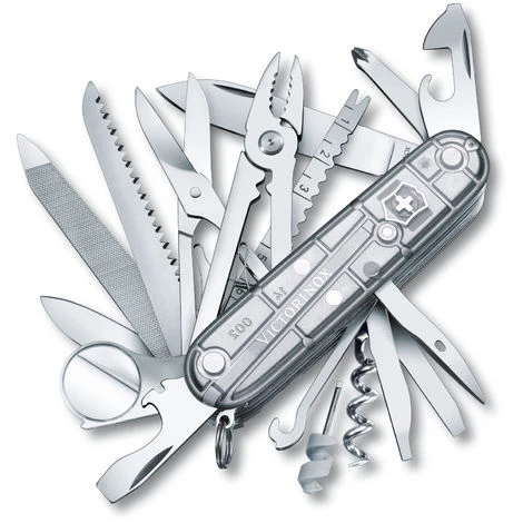 Soyez prêt à vous battre – le SwissChamp est là pour relever tous les défis. Avec 31 fonctions et des manches argentés transparents, ce couteau de poche est un outil parfait. Gardez-le dans votre poche pour vos aventures quotidiennes, et emportez-le avec vous pour explorer la nature sauvage. Du tournevis au tire-bouchon, du cure-dent aux ciseaux, le SwissChamp est un véritable athlète.