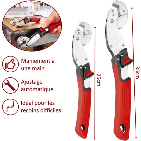 Setde 2 clés à molette Serre-écrou pour travaux de bricolage et recoinsdifficiles – Universel : s’adapte à tous types d’embouts, écrous, vis,Serrage : Ø 13-24 mm et 10-19 mm – Ajustement automatique avec sonbouton coulissant, pour une utilisation à une main – Ergonomique :revêtement anti-dérapant et poids léger : GM: 330g; PM: 163g – Matière: Acier #45 dureté HRC 40; poignée: PP+TPR – Dimension : 26 cm / 21 cm