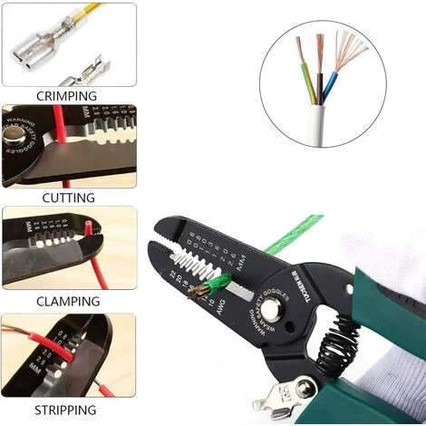【MULTIFONCTIONNEL ET PRATIQUE】En cours d’utilisation, veuillez d’abord couper le câble avec une extrémité cassée, puis utilisez une pince à dénuder pour sélectionner différentes tailles pour retirer le câble. Une fois connecté, vous pouvez sertir la gainedu câble avec les mâchoires, un produit, plusieurs fonctions, adaptées à différents scénarios.