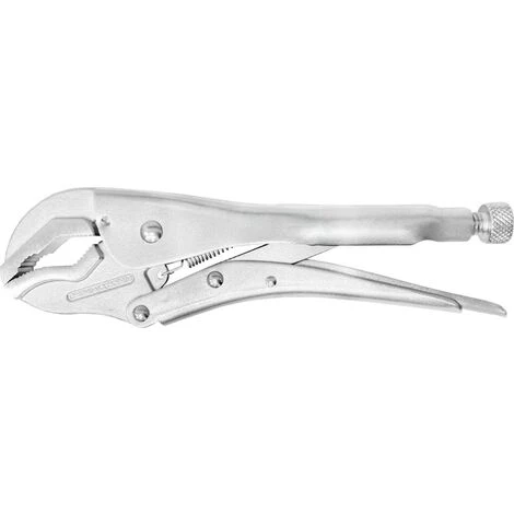 Gripzange mit PrismaAusführung: Zangenkörper aus Chrom-Molybdän-Stahl, vernickelt, mit Schnelllösehebel. Mit integriertem Drahtschneider und gezahnten Greifbacken. Die Einstellung der Spannweite und des Spanndruckes erfolgt mittels Einstellschraube.Anwendung: Ideal zum Greifen von Rohren und Bolzen sowie zum Lösen und Festziehen von Schrauben und Muttern.