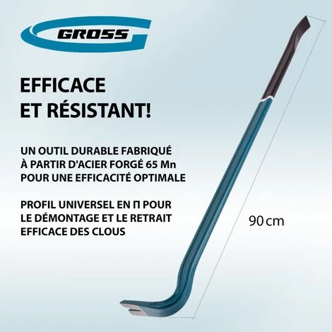 Utilisé principalement pour les travaux de construction, le pied de biche GROSS est fabriqué dans un acier forgé afin d’avoir la résistance demandée lors de sa manipulation. Sa forme spéciale lui permet elle aussi de renforcer l’outil et ainsi pouvoir travailler en toute sécurité.