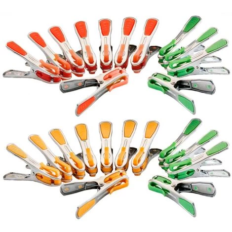 Révolutionnaire, voici un nouveau modèle de pinces à linge X24 qui augmente la capacité d’étendage de votre linge grâce à ses crochets-clips de suspension en plastique.Très pratiques, les clips situés sur la tête de la pince vous permettent de suspendre votre lingerie, vos hauts à bretelles, sans créer de marques disgracieuses sur le tissu.Tout inox, elles ne rouillent pas, ne tâchent pas le linge et sont incassables !Leur design exclusif leurs offre une prise en main facilitée grâce aux surfaces anti-dérapantes. Dotées de patins de protection, elles prennent soin de votre linge et ne laissent aucune marque sur vos vêtements.Dimensions de l’épingle à linge en inox- Dimensions d’une pince : Longueur 6 CM x largeur 1,3 CM- 3 coloris tendances : vert, orange et rouge- Livré par lot de 24 pinces- 2 clips par pince- Matière : pince inox et crochet plastique- Pinces avec ressorts