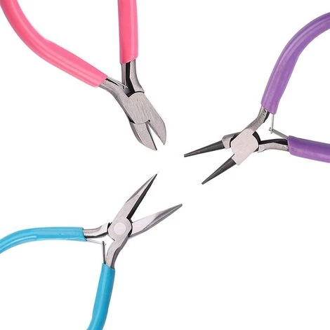 Ensemble de trois pièces :Lot de Pince Bijoux contient trois pinces à bijoux de base, dont une pince à bec rond violet, une pince diagonale rose et une pince à bec effilé bleue.