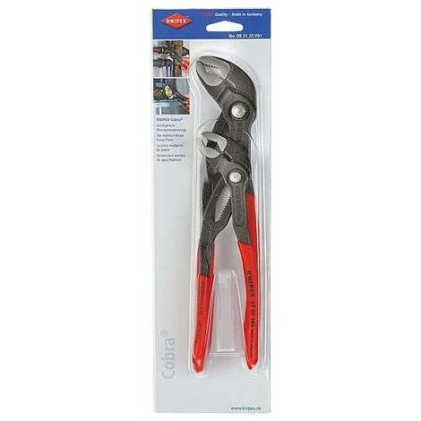 Jeu de 2 pinces multiprise Cobra entrepassée à bouton pression en 180 mm et 250 mm, Jeu de 2 pinces Cobra en 180 mm capacité d’ouverture 36 mm et en 250 mm à 25 positions de réglage, capacité 46 mm.