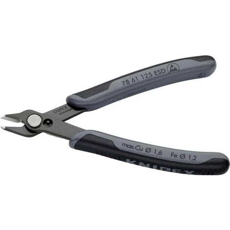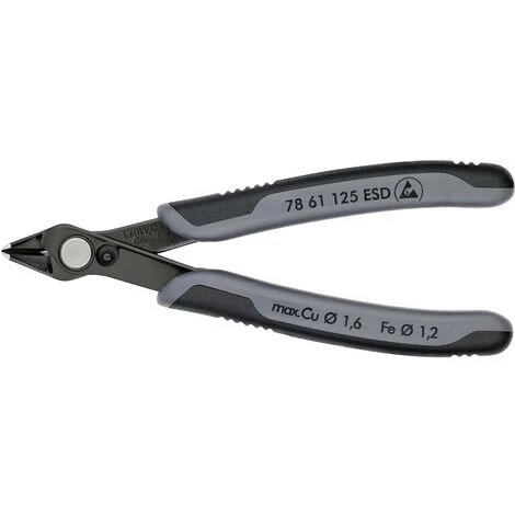 Tranchants trempés par induction, dureté d’environ 64 HRC. Acier spécial pour outils, bruni. Pinces de précision pour une découpe minutieuse parfaite comme pour l’électronique et la mécanique de précision. Poignées dérivant l’électricité – dissipatives Tranchants rectifiés très coupants sans facette. Cisaillement à microdécalage contrôlé de l’arête de coupe pour une coupe très précise, même des fils les plus fins et une longue durée de vie. Pointes parfaitement usinées permettant également la coupe de fils contigus dès Ø 0,2 mm. Charnière avec rivet en acier inoxydable. Utilisation confortable pour un travail moins pénible Avec ressort et limitation d’ouverture Poignée avec gaine multi-composants noir/gris. Acier spécial pour outils de qualité exceptionnelle, durci en bain d’huile