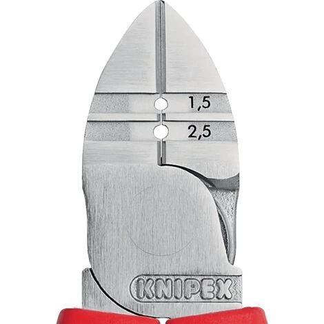 avec 2 trous de dénudage de précision pour conducteurs de 1,5 et 2,5 mm² · avec lames de précision trempées inductives, dureté de coupe env. 60 HRC · acier électrique au vanadium, forgé, trempé à l’huile en plusieurs couches pince noire atramen
