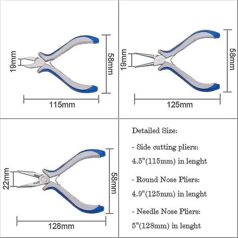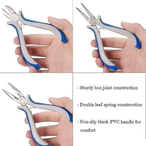 dcrire taille du produit: Cutter Taille: environ 5.8cm * 11.5cm Taille des pinces sertir: environ 5.8cm * 12.5cm Taille des pinces plates: environ 5.8cm * 12.8cm Couleur: Bleu Blanc (ENSEMBLE Doutils de bijoux DIY) Ensemble doutils de bijoux DIY, Ensemble de pinces, Pointe ronde, Pinces de coupe latrale et Ensemble doutils de bijoux pour votre fabrication de bijoux, ceux-ci rendront votre processus de fabrication plus pratique et parfait. Prenez votre temps avec les dtails et vous en sortirez un bijou captivant. Matriel: Acier au carbone Utilisation: pinces Catgorie: Pinces