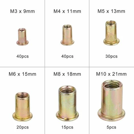 Contenu du colis: M3 x 9 mm – 40 pièces M4 x 11 mm – 40 pièces M5 x 13 mm – 30 pièces M6 x 15 mm – 20 pièces M8 x 18 mm – 15 pièces M10 x 21 mm – 5 pièces