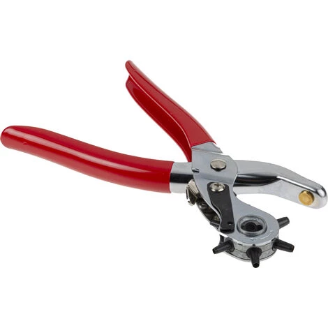Pince emporte-pièce. La pince emporte-pièce permet de percer des trous dans des matériaux comme le cuir. Cet outil comporte six diamètres de perforations (2, 2,4, 2,8, 3,2, 4 et 4,8 mm). Aprèsperforation, les trous peuvent être facilement agrandis pour recevoir des fixations plus importantes. La pince est conforme à la spécification militaire MIL-P-2001-D et est réalisée en acier nickelé brillant avec poignéesgainées de PVC.