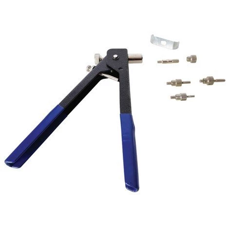Pour la pose de rivets filetés dans les matériaux de faible épaisseur. Idéale pour la tôle, le plastique et la fibre de verre. Livrée avec inserts de 4 mm, 5 mm, 6 mm et 8 mm. Poignées caoutchoutées à attache permanente.