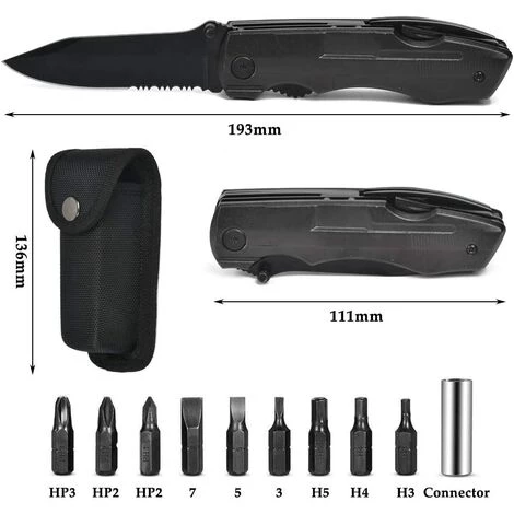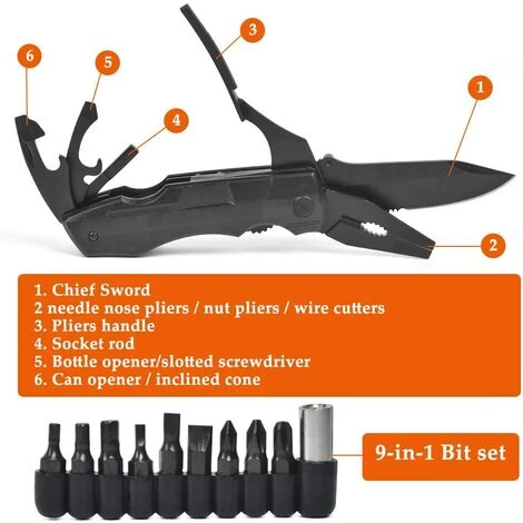 【Gagnez de l’Argent et de l’Espace】:Ne gaspillez pas votre argent pour acheter d’autres outils coûteux! C’est un outil multifonction bon marché, durable, sophistiqué et compact. Cette pince multifonctions possède cinq fonctions: couteau, pince, ouvre-boîtes, ouvre bouteille et un tournevis avec un jeu de 9 embouts. La conception pliante vous permet un gain de place!