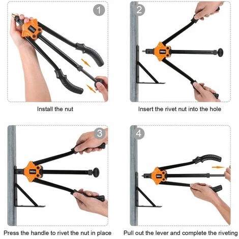 【Outil d’écrou de rivet de tige de pompage automatique】 Une tige de pompage exclusive entre les poignées conçue pour un chargement et un déchargement rapides des écrous à rivet taraudés.