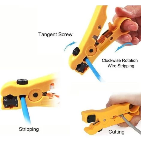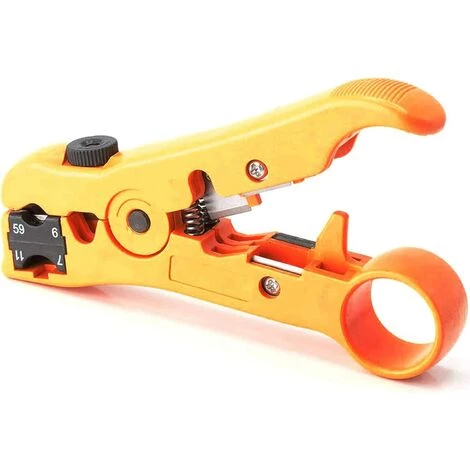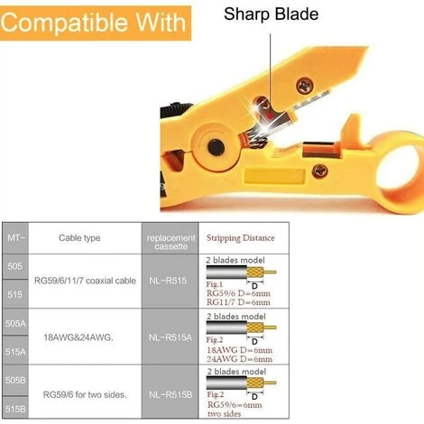 [Multi-usage] Convient pour dénuder et couper divers câbles : câble réseau (Cat5, Cat5e, Cat6, UTP, STP), câble coaxial (RG59, RG6, RG7, RG11), câbles ronds et plats, etc. [Très réglable] Tournez la vis pour ajuster l’espace de la lame pour différentes épaisseurs d’isolation afin d’éviter d’endommager le blindage et le conducteur. [Réversible] La cassette est réversible, un côté est disponible pour le RG 59/6 et un autre côté pour le RG 7/11. [Léger et facile à utiliser] Conception de bracelet légère et compacte, éloignez votre main de la lame, tournez doucement pour dénuder le fil. [Opération à une main] Conception ergonomique et à ressort, facile à utiliser. C’est une option économique et sa petite taille se glisse dans n’importe quelle poche, pochette ou coffre à outils.