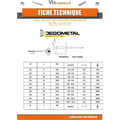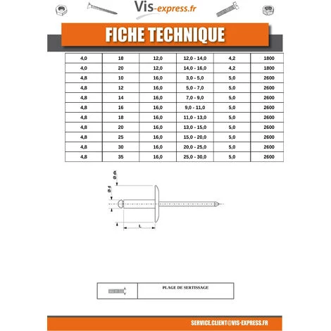 Rivet Aluminium Tige acier 4.8X12 epaisseur de serrage 5 a 7 eete extra large TEL ALXRivet Aluminium Tige acier 4.8X12 epaisseur de serrage 5 a 7 eete extra large TEL ALX